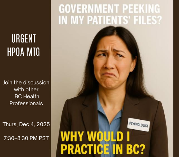 HPOA Actions: Dr. Anna Kindy, MLA and Health Critic is looking to hear from those who are concerned...stories and letters of all who have already left their profession, as well as those who plan to leave their profession, leave BC, or change their practice due to HPOA. Email: Anna.Kindy.MLA@leg.bc.ca Subject: "HPOA CONCERNS" in the subject line Health Professional Survey - For ALL Health Professionals Fill out the survey to show what professionals are thinking and can capture how many are looking to leave their professions. For previous and current regulated health professionals in BC.