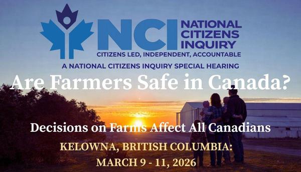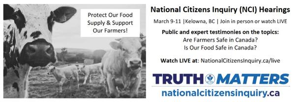 The National Citizens Inquiry (NCI) will begin their next round of hearings March 9-11 in Kelowna, BC! The theme of these hearings is: Are Farmers Safe in Canada? Is Our Food Safe in Canada?